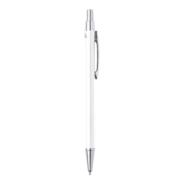 Aluminiowy długopis z recyklingu z chromowanymi elementami. Z niebieskim wkładem.