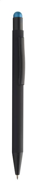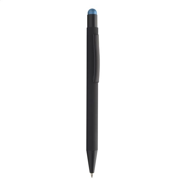 Aluminiowy długopis z końcówką do ekranów dotykowych i gumowanym wykończeniem. Posiada specjalny podkład pod lustrzany grawer w kolorze gumki. Niebieski wkład.