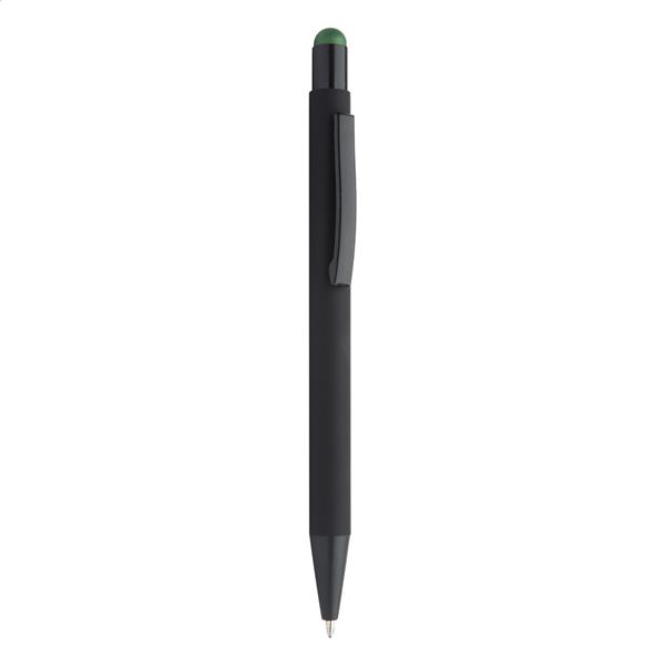 Aluminiowy długopis z końcówką do ekranów dotykowych i gumowanym wykończeniem. Posiada specjalną powłokę pod grawer lustrzany pasujący kolorystycznie do gumki.