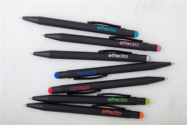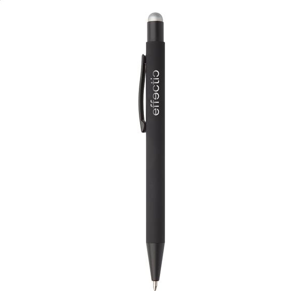 Aluminiowy długopis z końcówką do ekranów dotykowych i gumowanym wykończeniem. Posiada specjalną powłokę pod grawer lustrzany pasujący kolorystycznie do gumki.
