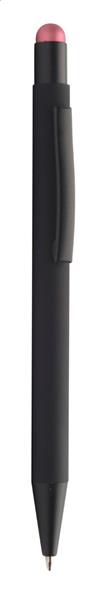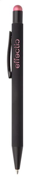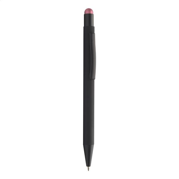 Aluminiowy długopis z końcówką do ekranów dotykowych i gumowanym wykończeniem. Posiada specjalną powłokę pod grawer lustrzany pasujący kolorystycznie do gumki.