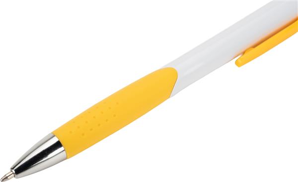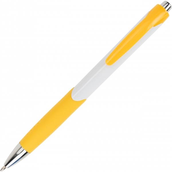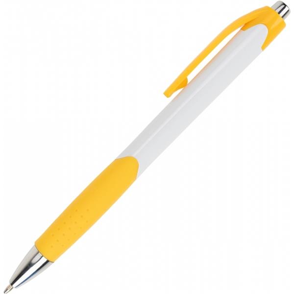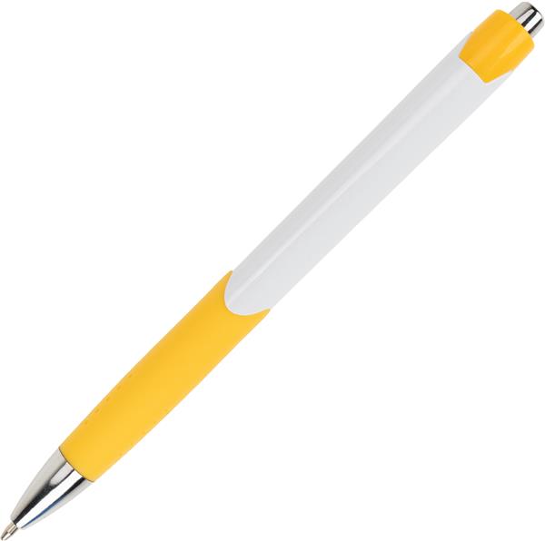 Długopis plastikowy, wyposażony w klips i gumową strefę chwytu oraz niebieski wkład.