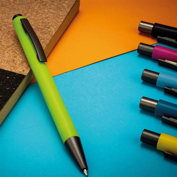 Plastikowy długopis z niebieskim wkładem, kolorową obudową i metalowym klipsem.