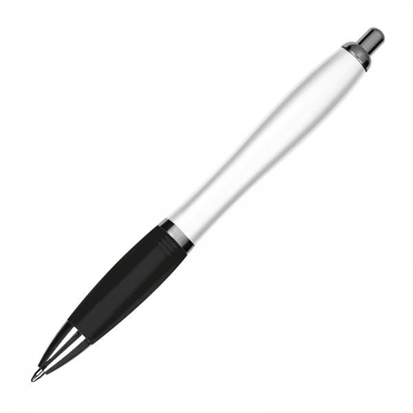 Długopis plastikowy z białym korpusem i kolorową gumką ułatwiającą trzymanie. Wyposażony w metalowy klips i duży wkład piszący na niebiesko.