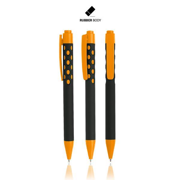 Długopis plastikowy z gumowaną powłoką, z mechanizmem wciskanym, pisze na niebiesko. Rozmiar: 14 x 1 cm DC0 (długopisy, zapalniczki): 4 x 0,6 cm Kolor: Pomarańczowy