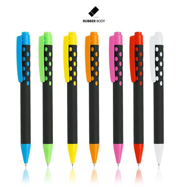 Długopis plastikowy z gumowaną powłoką, z mechanizmem wciskanym, pisze na niebiesko.