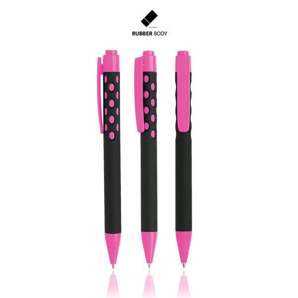 Długopis plastikowy z gumowaną powłoką, z mechanizmem wciskanym, pisze na niebiesko. Rozmiar: 14 x 1 cm DC0 (długopisy, zapalniczki): 4 x 0,6 cm Kolor: Różowy