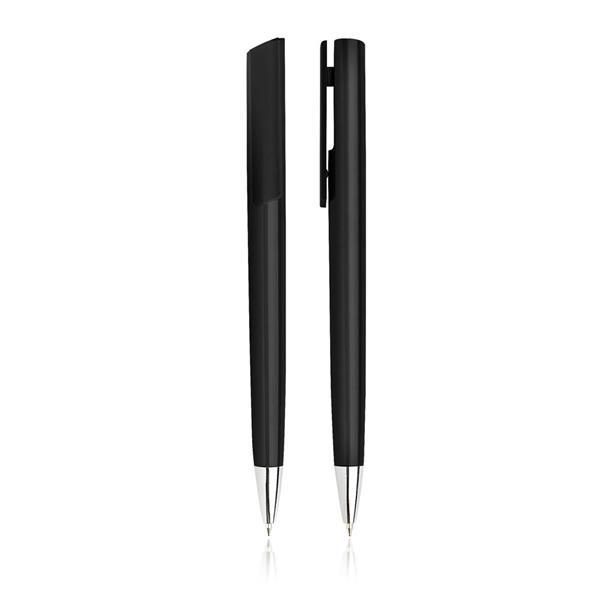 Długopis plastikowy z mechanizmem wciskanym, pisze na niebiesko. Rozmiar: 14 x 0,9 cm T1 (tampodruk): 4 x 0,6 DC0 (długopisy, zapalniczki): 5 x 0,6 cm Kolor: Czarny