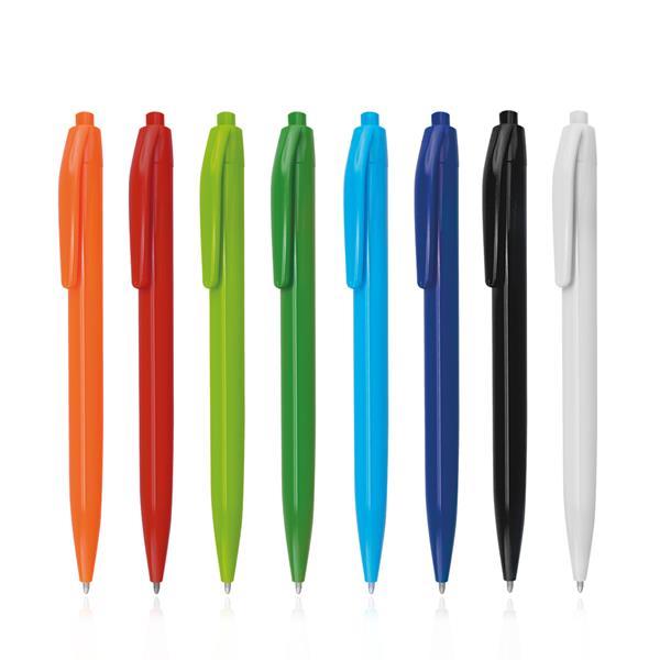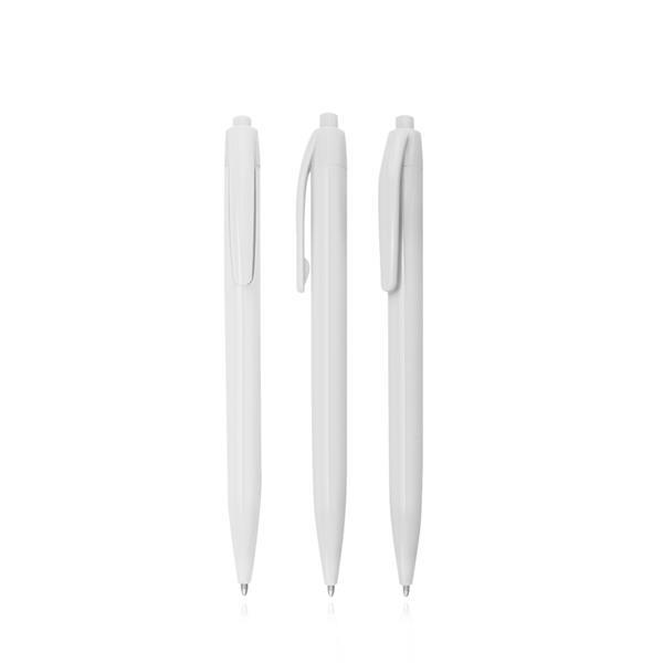 Plastikowy długopis z mechanizmem wciskanym, pisze na czarno. Rozmiar: 14 x 1 cm T1 (tampodruk): 5 x 0,6 DC0 (długopisy, zapalniczki): 6 x 0,5 cm Kolor: Biały