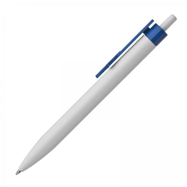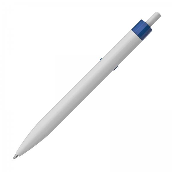 Biały długopis plastikowy CrisMa z rączką 2D (wskazującą palcem). Posiada wkład piszący na niebiesko.