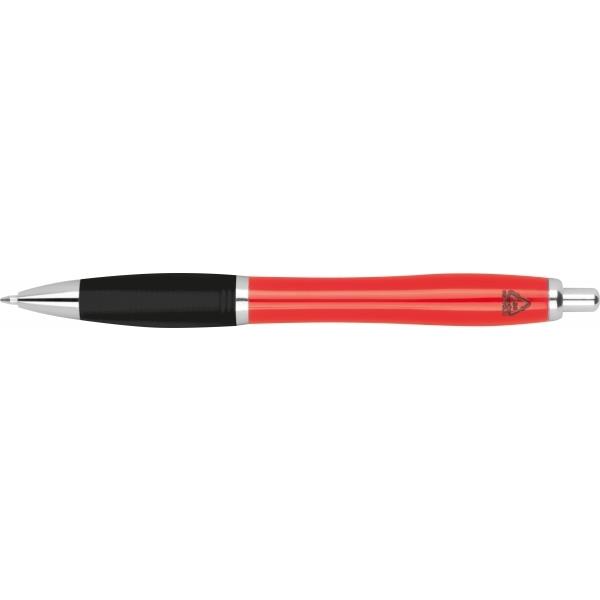 Plastikowy długopis z gumową strefą uchwytu oraz dużym niebieskim wkładem.
