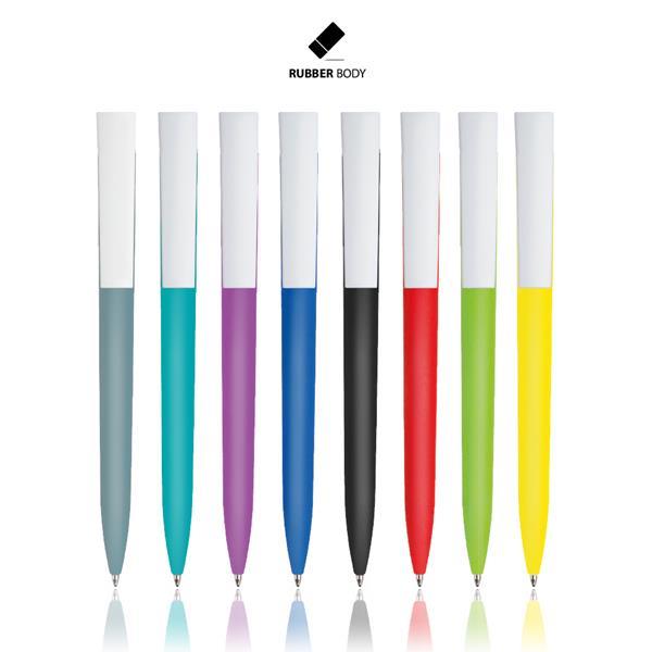 Długopis plastikowy z gumowaną powłoką soft touch, mechanizmem obrotowym oraz dużym klipiem. Pisze na czarno.