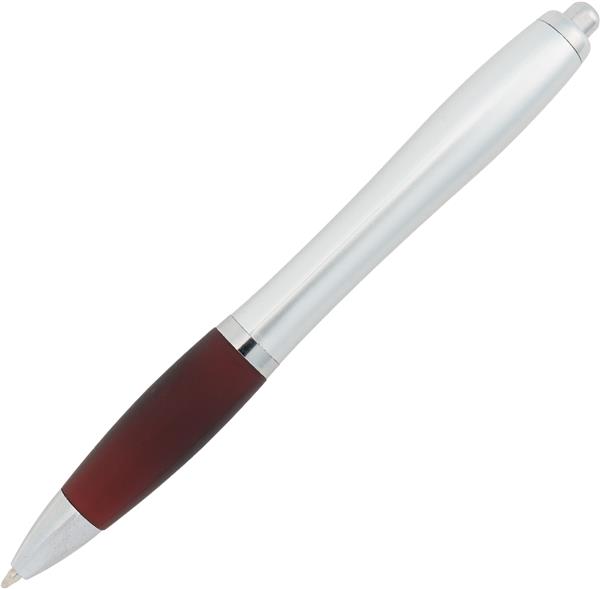 Plastikowy długopis z satynowym połyskiem, metalowym klipsem, gumowanym korpusem i dużym niebieskim wkładem.