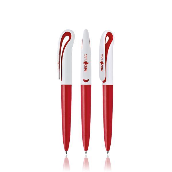 Długopis plastikowy z wygiętym klipsem i mechanizmem obrotowym, pisze na czarno.