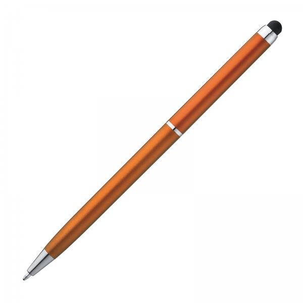 Smukły długopis plastikowy z mechanizmem obrotowym. Posiada wkład piszący na niebiesko i końcówkę do obsługi ekranów dotykowych.