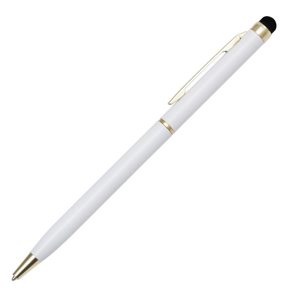 Długopis z końcówką przystosowaną do ekranów dotykowych. Korpus wykonany z plastiku, skuwka z metalu. Wkład w kolorze niebieskim. Posiada obrotowy mechanizm włączania.