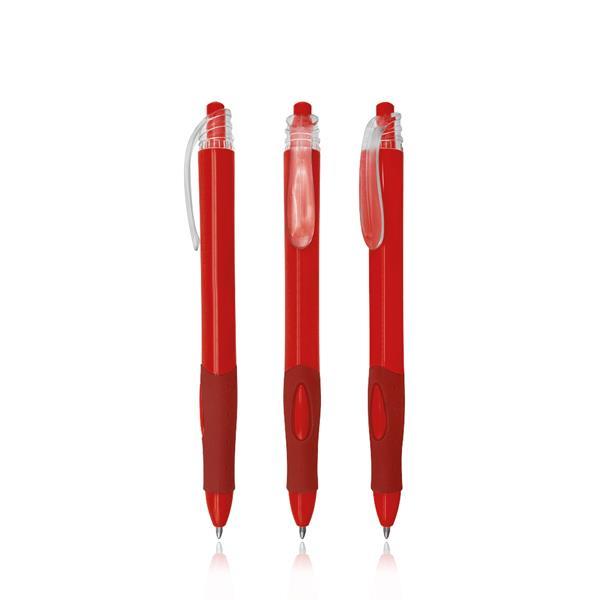 Plastikowy długopis z przezroczystym klipsem, z mechanizmem wciskanym, pisze na czarno. Rozmiar: 14 x 1 cm T1 (tampodruk): 4,5 x 0,6 Kolor: Czerwony