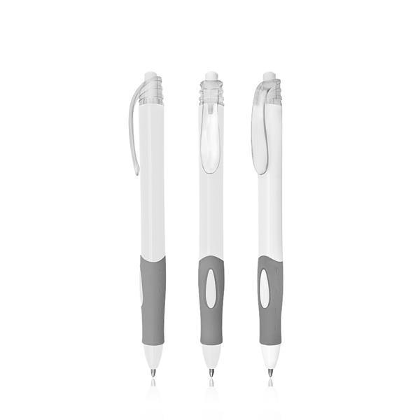 Plastikowy długopis z przezroczystym klipsem, z mechanizmem wciskanym, pisze na czarno. Rozmiar: 14 x 1 cm T1 (tampodruk): 4,5 x 0,6 Kolor: Biały
