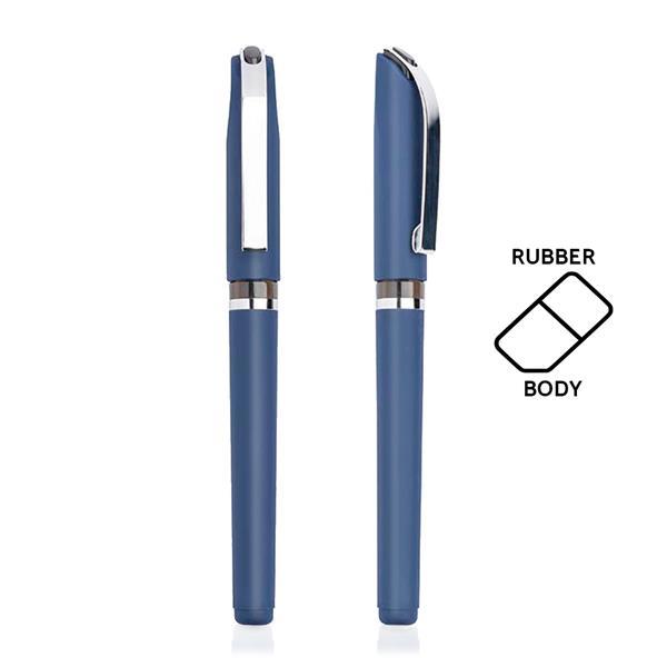 Plastikowy długopis z elementami w srebrnym kolorze. Rozmiar: 12 x 1,6 cm DC1 (druk cyfrowy UV do 12 cm2): 3 x 0,6 cm Kolor: Granatowy