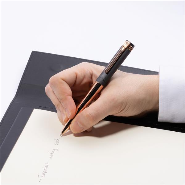 Pióro kulkowe Prestige w kolorze czarno-złotym inspirowane jest zegarkami Festina. Charakteryzuje się elegankim, minimalistycznym wykończeniem. To połączenie matowej, chromowanej nasadki i błyszczącego chromowanego korpusu i lamówek. Rozmiar: Dia. 13 / h. 142 mm Kolor: Szary