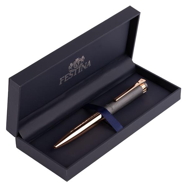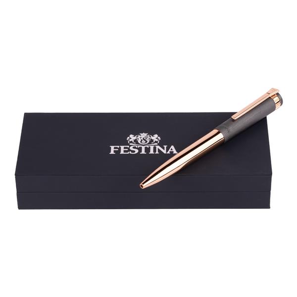 Pióro kulkowe Prestige w kolorze czarno-złotym inspirowane jest zegarkami Festina. Charakteryzuje się elegankim, minimalistycznym wykończeniem. To połączenie matowej, chromowanej nasadki i błyszczącego chromowanego korpusu i lamówek.