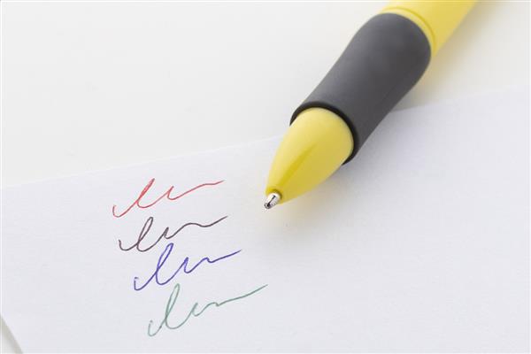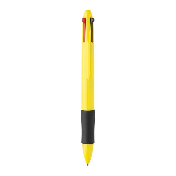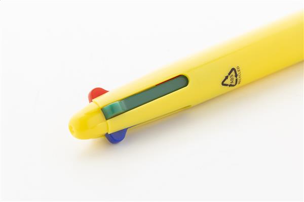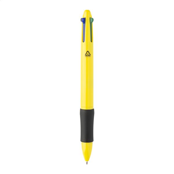 Wielokolorowy długopis z recyklingowanego tworzywa ABS z gumowym uchwytem. Z wkładami w kolorze czarnym, niebieskim, czerwonym i zielonym.