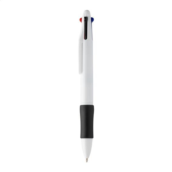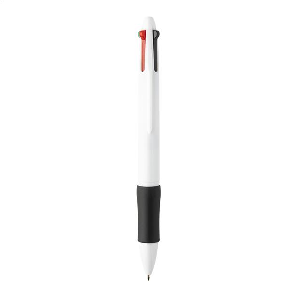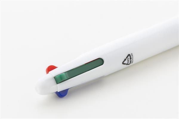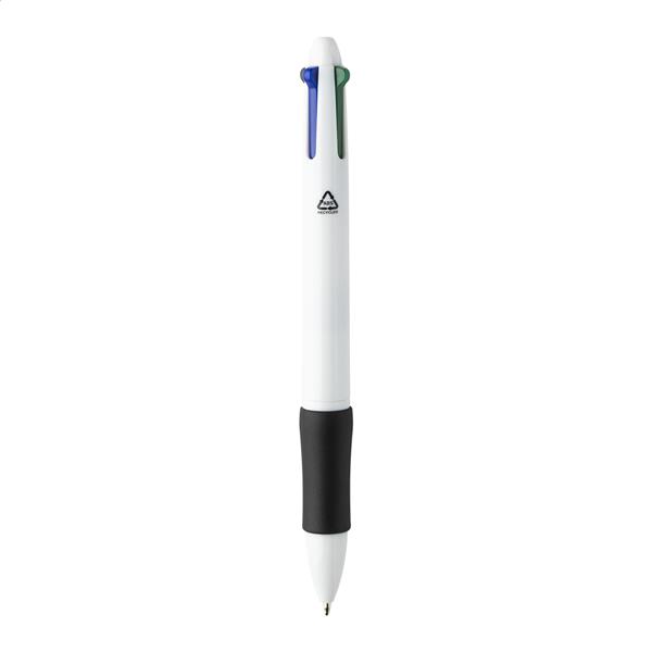 Wielokolorowy długopis z recyklingowanego tworzywa ABS z gumowym uchwytem. Z wkładami w kolorze czarnym, niebieskim, czerwonym i zielonym.