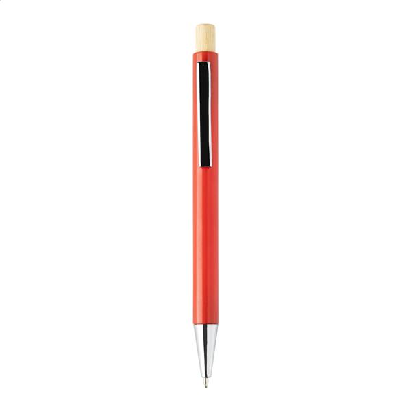 Długopis z tworzywa sztucznego ABS z recyklingu z bambusowym przyciskiem i metalowym klipem. Z niebieskim wkładem.
