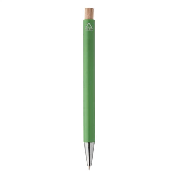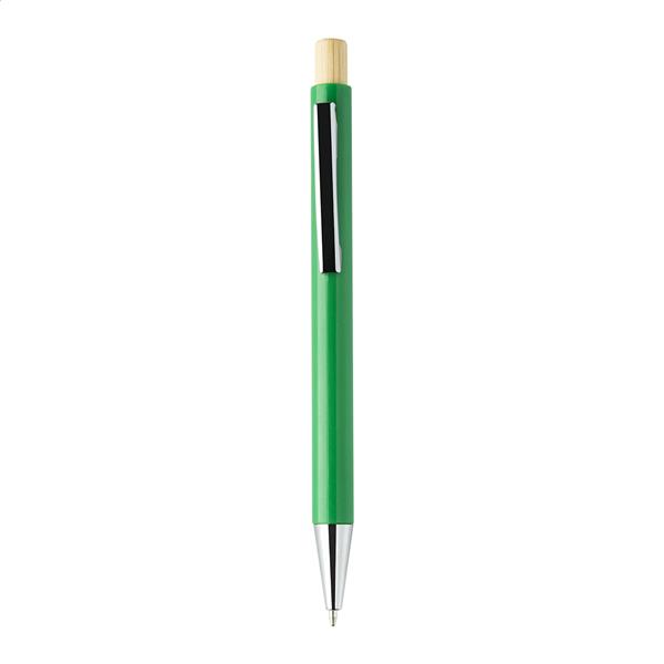 Długopis z tworzywa sztucznego ABS z recyklingu z bambusowym przyciskiem i metalowym klipem. Z niebieskim wkładem.