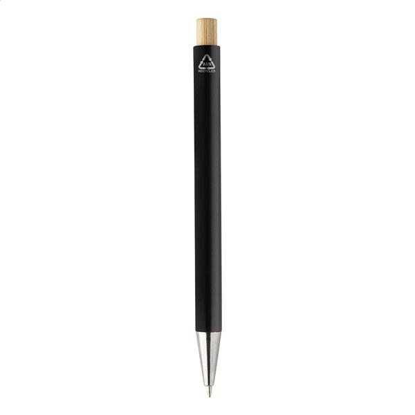 Długopis z tworzywa sztucznego ABS z recyklingu z bambusowym przyciskiem i metalowym klipem. Z niebieskim wkładem.