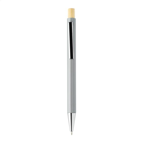 Długopis z tworzywa sztucznego ABS z recyklingu z bambusowym przyciskiem i metalowym klipem. Z niebieskim wkładem.