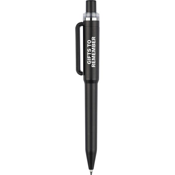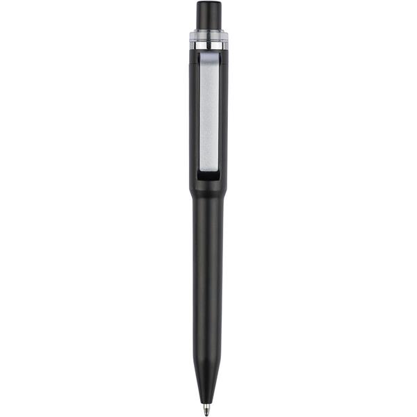 Długopis RABS, w kształcie kubka podróżnego, z metalicznym wykończeniem, wkład w niebieskim kolorze o długości pisania 800 metrów, mechanizm przyciskowy, ikona ABS z recyklingu, plastikowy przycisk, klips oraz chromowany plastikowy pierścień na górze