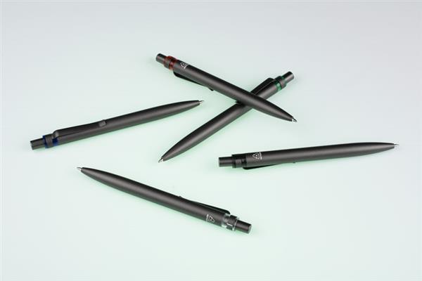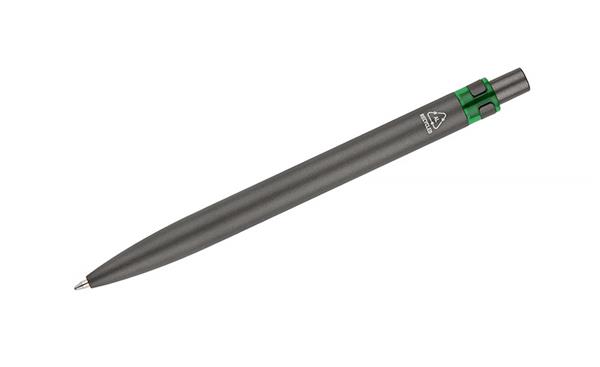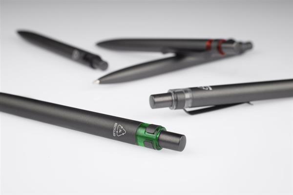 Długopis RAL wykonany jest z recyklingowanego aluminium w eleganckim, grafitowym kolorze z chromowanym wykończeniem. Aluminiowy klips zakończony kolorowym akcentem nadaje mu nowoczesny i rozpoznawalny wygląd. Mechanizm wysuwu jest automatyczny, co zapewnia wygodę i szybkie użycie w każdej sytuacji. Smukła forma oraz przyjemny w dotyku korpus gwarantują komfort pisania. Wkład typu G2 o grubości linii 1,0 mm zapewnia płynny i precyzyjny zapis. To praktyczny gadżet reklamowy, który świetnie sprawdzi się w biurze i podczas spotkań biznesowych.