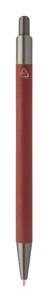 Długopis aluminiowy z recyklingu z gumowanym korpusem i elementami w kolorze gunmetal. Z niebieskim wkładem. Kolor wkładu: Niebieski Material 2: Guma Rodzaj długopisy: Długopis Rodzaj mechanizmu: wciskany Rozmiar: o9×140 mm Primary Color: czerwony Material 1: Aluminium z recyklingu Description: Długopis aluminiowy z recyklingu z gumowanym korpusem i elementami w kolorze gunmetal. Z niebieskim wkładem.