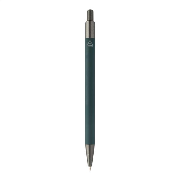 Długopis aluminiowy z recyklingu z gumowanym korpusem i elementami w kolorze gunmetal. Z niebieskim wkładem.