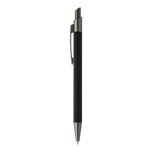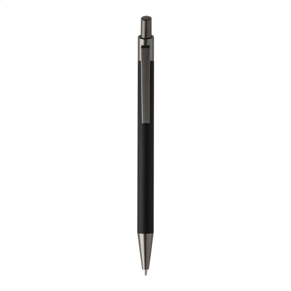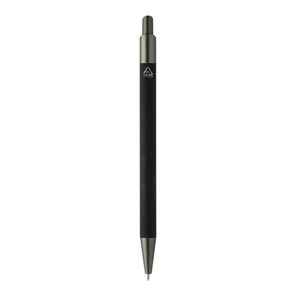 Długopis aluminiowy z recyklingu z gumowanym korpusem i elementami w kolorze gunmetal. Z niebieskim wkładem.