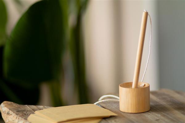 Bambusowy długopis recepcyjny z samoprzylepnym stojakiem. Długopis jest przymocowany do stojaka za pomocą bawełnianego sznurka. Z niebieskim wkładem.