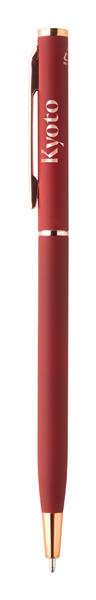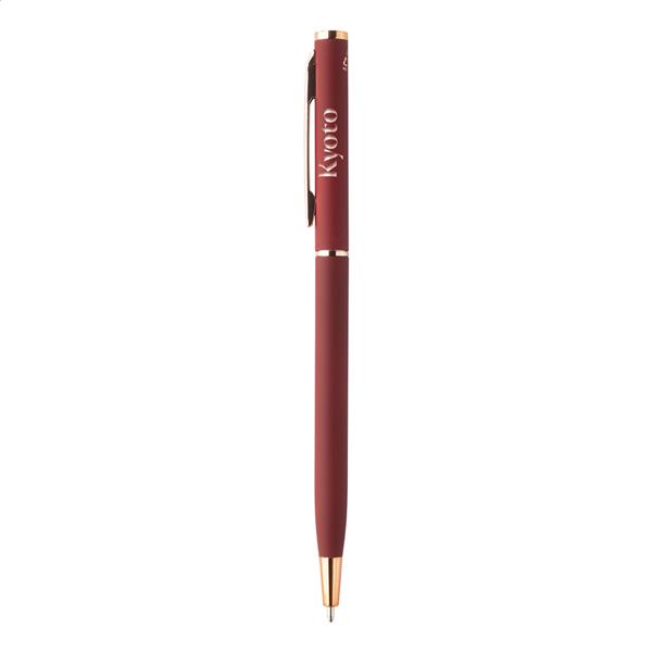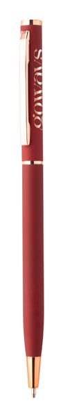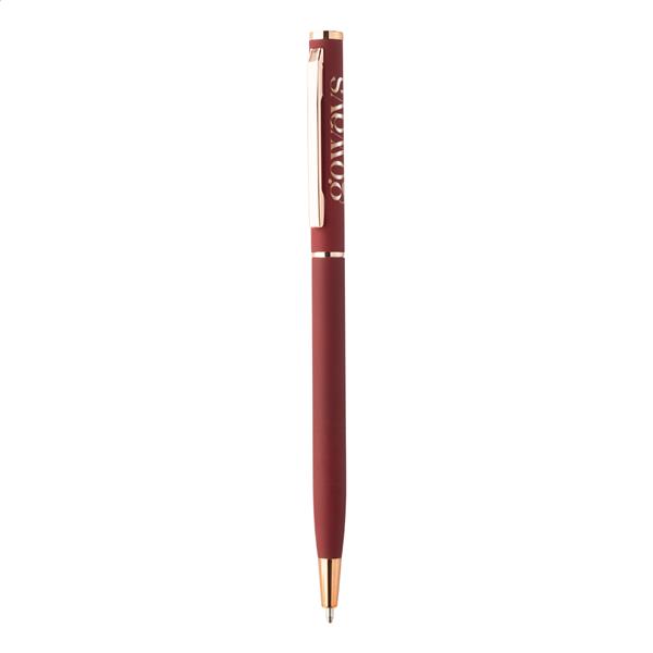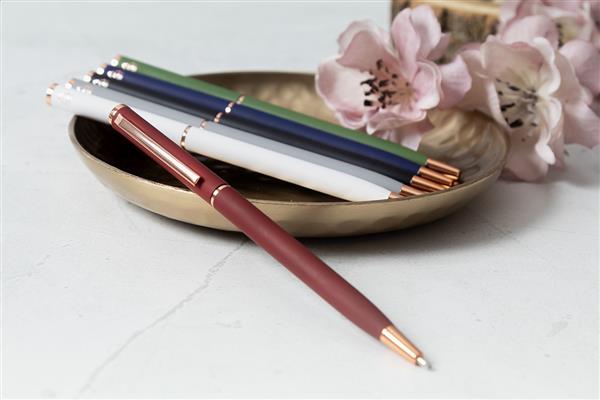 Przekręcany długopis z aluminium pochodzącego z recyklingu, z gumowanym wykończeniem i detalami w kolorze różowego złota.Ze specjalną powłoką pod grawer lustrzany w kolorze różowego złota. Z niebieskim wkładem.