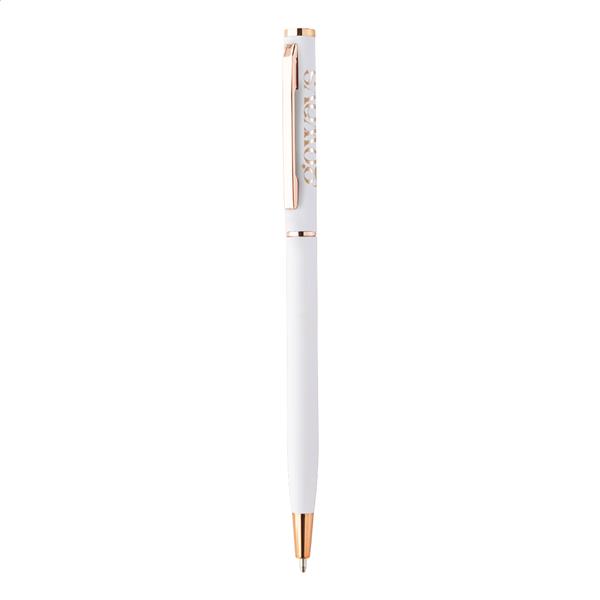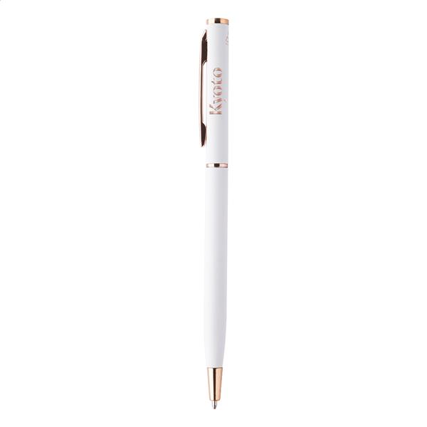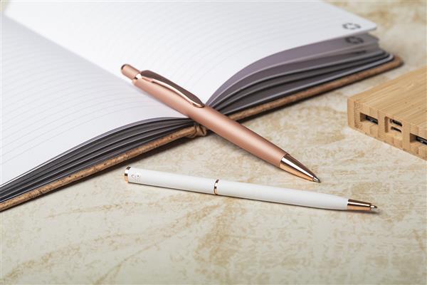 Przekręcany długopis z aluminium pochodzącego z recyklingu, z gumowanym wykończeniem i detalami w kolorze różowego złota.Ze specjalną powłoką pod grawer lustrzany w kolorze różowego złota. Z niebieskim wkładem.