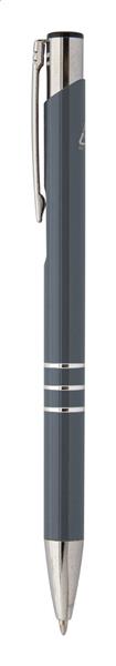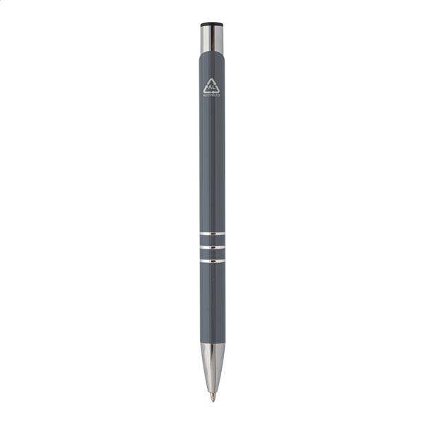 Aluminiowy długopis z recyklingu z niebieskim wkładem.