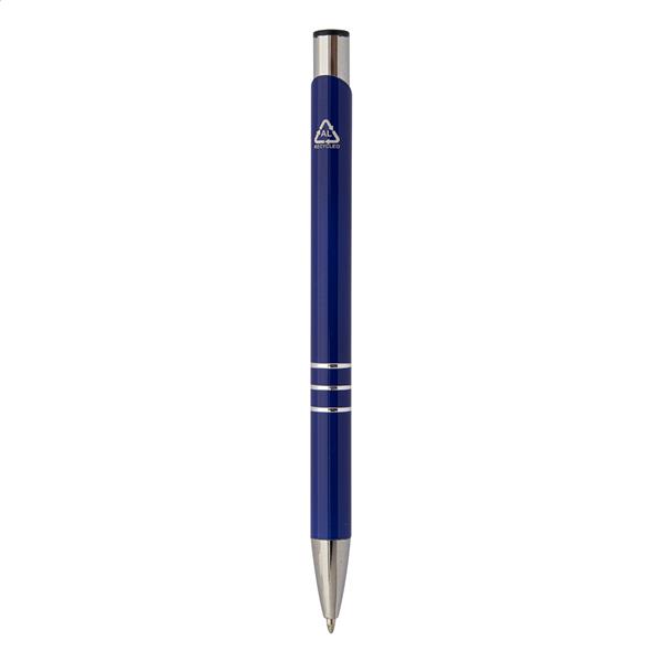 Aluminiowy długopis z recyklingu z niebieskim wkładem.