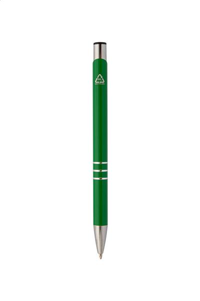 Aluminiowy długopis z recyklingu z niebieskim wkładem.