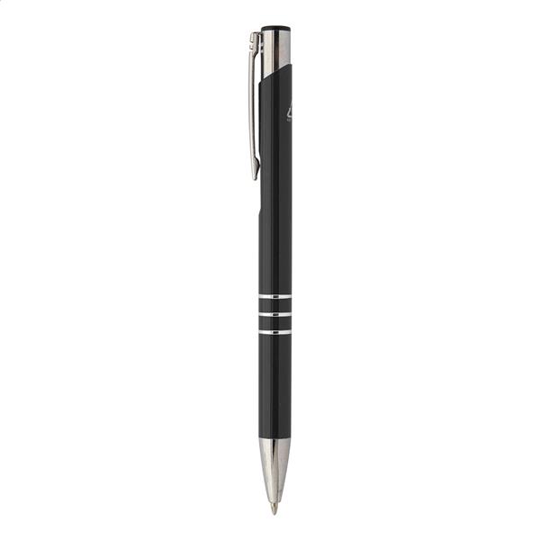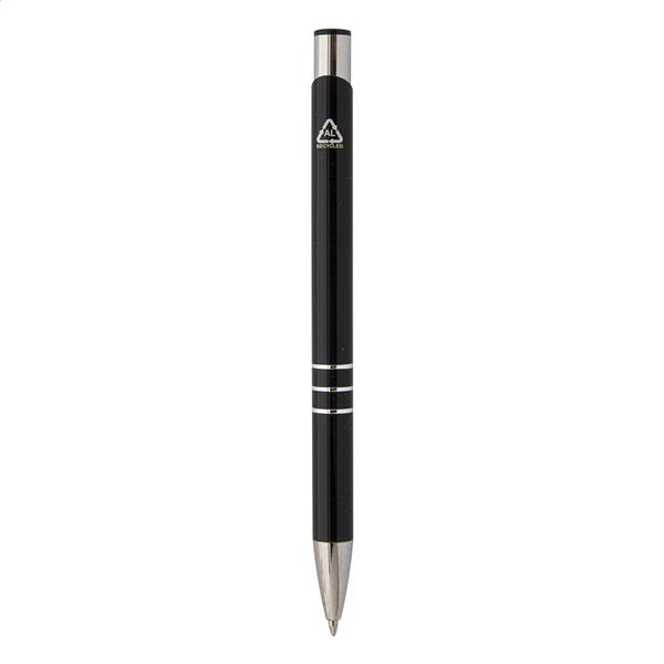 Aluminiowy długopis z recyklingu z niebieskim wkładem.