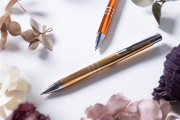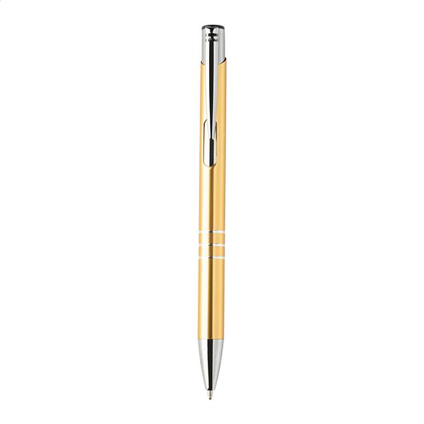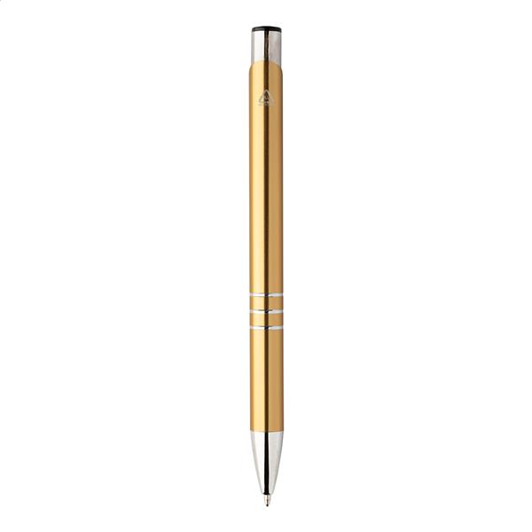 Długopis aluminiowy z recyklingu, z metalicznym wykończeniem i niebieskim wkładem.
