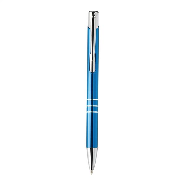 Długopis aluminiowy z recyklingu, z metalicznym wykończeniem i niebieskim wkładem.