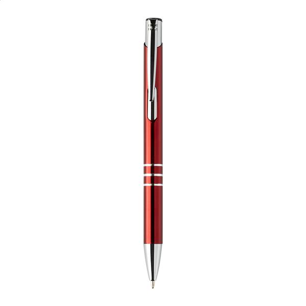 Długopis aluminiowy z recyklingu, z metalicznym wykończeniem i niebieskim wkładem.