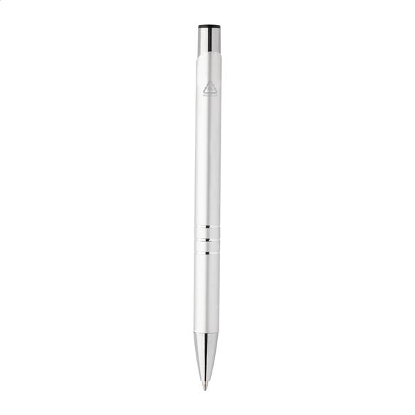 Długopis aluminiowy z recyklingu, z metalicznym wykończeniem i niebieskim wkładem.