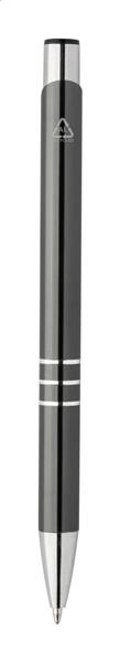 Długopis aluminiowy z recyklingu, z metalicznym wykończeniem i niebieskim wkładem.