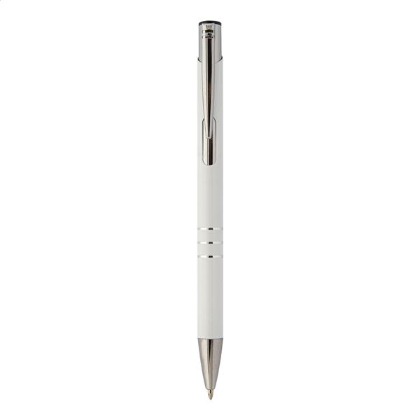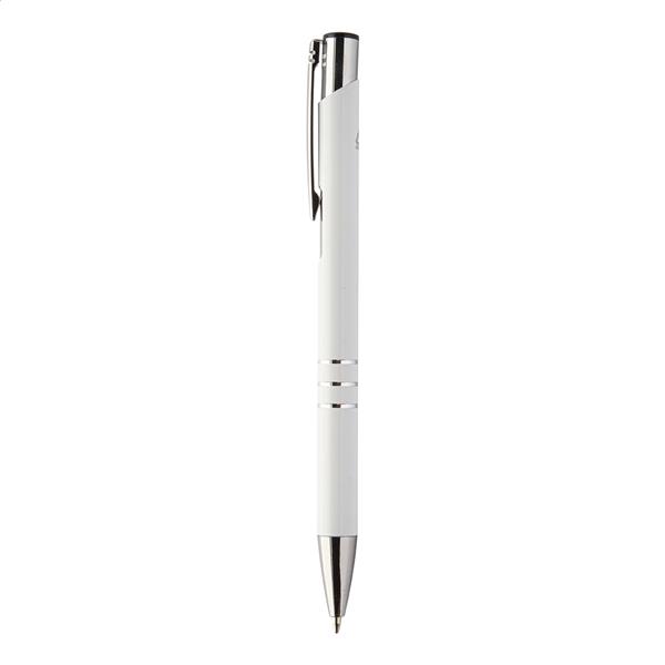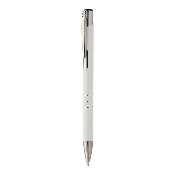 Aluminiowy długopis z recyklingu z niebieskim wkładem.