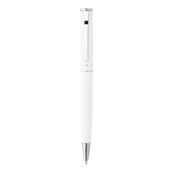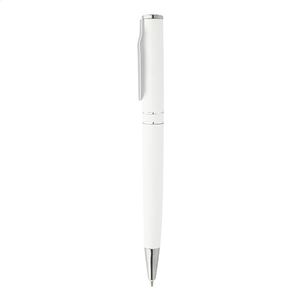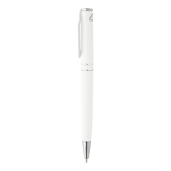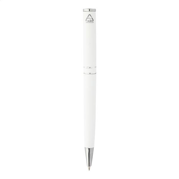 Długopis z przekręcanym wkładem z recyklingowanego aluminium, z chromowanymi elementami i pierścieniami. W czarnym pudełku prezentowym. Z niebieskim wkładem.